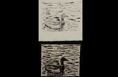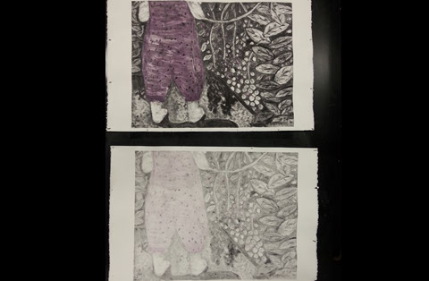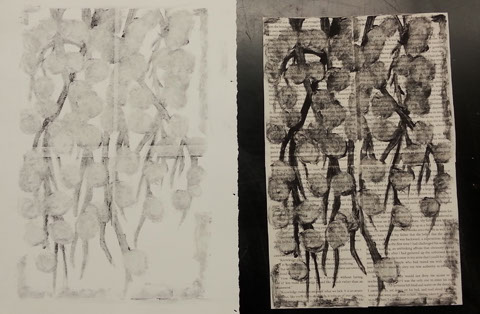 Monotype Print. Spring 2015. Prints available upon request. Study using book paper. Left is the ghost on regular paper. Right is the first drop on book paper.