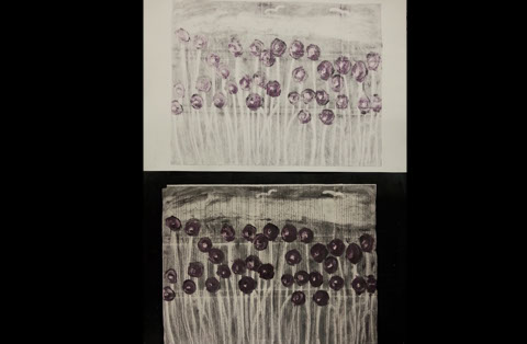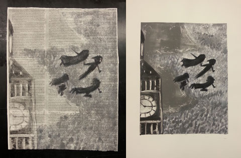 Monotype Print. Spring 2015. Left side is the ghost on book paper. Right side is the first drop. Experiment with transparency additive and book paper.