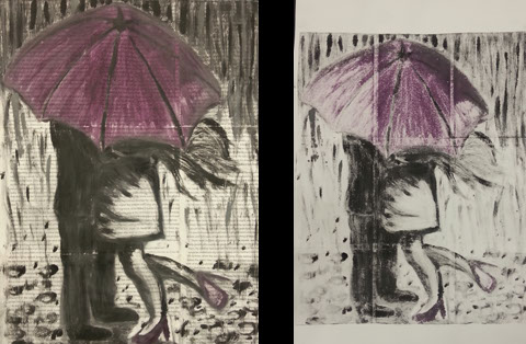 Monotype Print. Spring 2015. Prints available upon request. Study with using book paper, using a pop of color, and using an umbrella theme. Left is the first drop on book paper. Right is the ghost on regular paper.