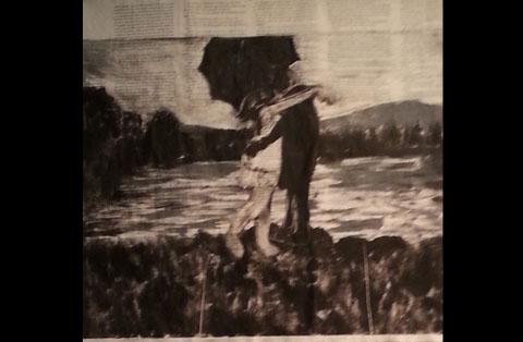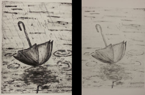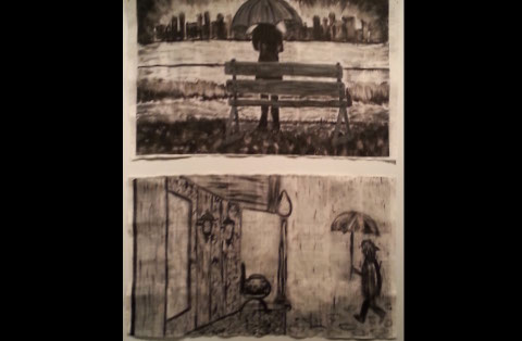 Monotype Print. Spring 2015. Prints available upon request. Study using theme of umbrellas and rain. Left is the first drop. Right is the ghost.