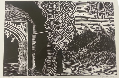 Linoleum Cut Print. Spring 2015. Prints available upon request. Title: Dare to Enter. Study using theme of silhouettes and nature.