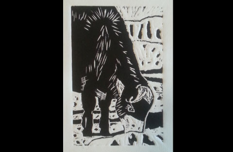 Linoleum Cut Print. Spring 2014. Prints available upon request. Study of relief printing and taking a photo and turning it into a black and white print.