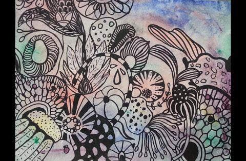 Mixed Media Abstract Watercolor Painting plus Ink Pen. Spring 2015. Prints available upon request. Experiment with abstract background and drawn abstract ink design.